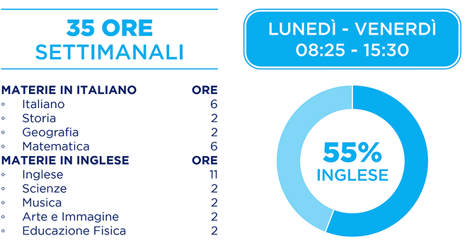 La Scuola Primaria Pianca School offre un curriculum estremamente ricco di opportunità, equilibrato tra italiano e inglese, per favorire lo sviluppo di competenze linguistiche e lessicali eccellenti in tutti i corsi.